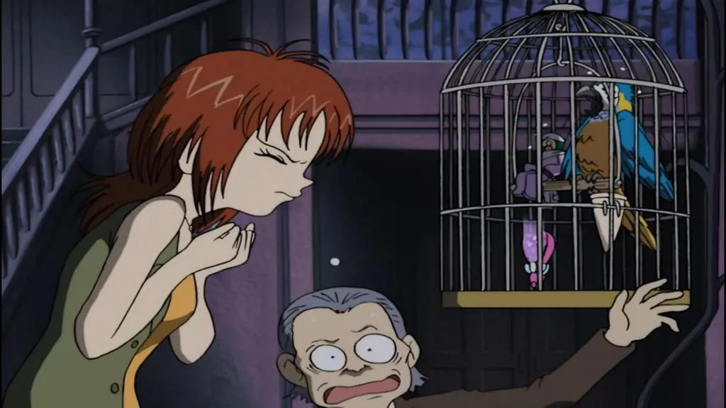 相変わらずオウムと一緒にかごの中。自分を亡き者にすれば石の力を操れないことで