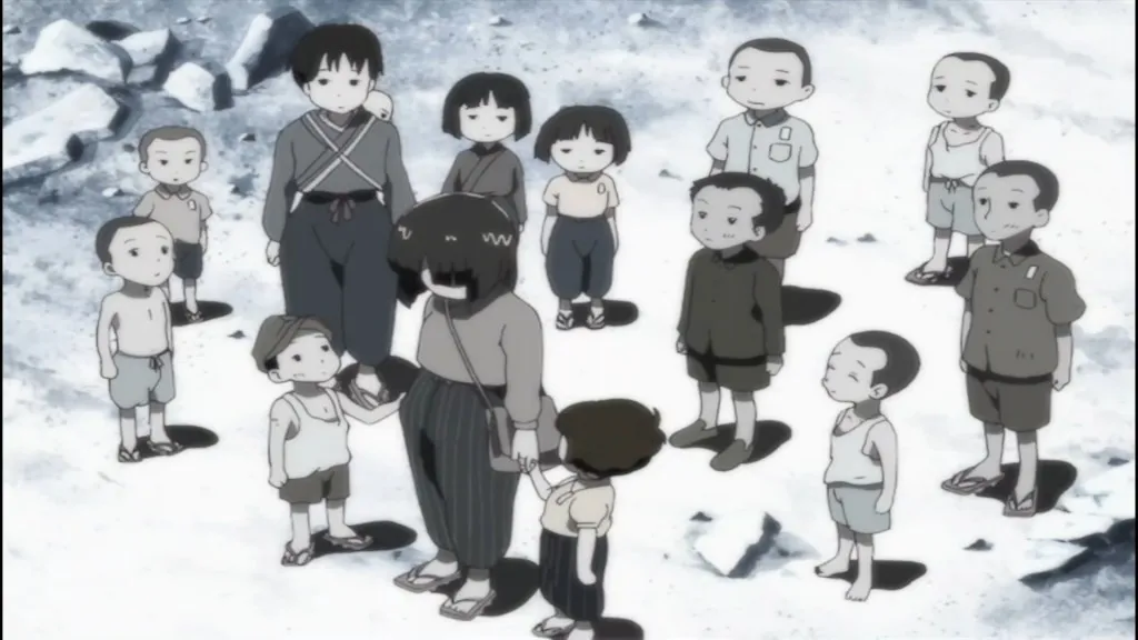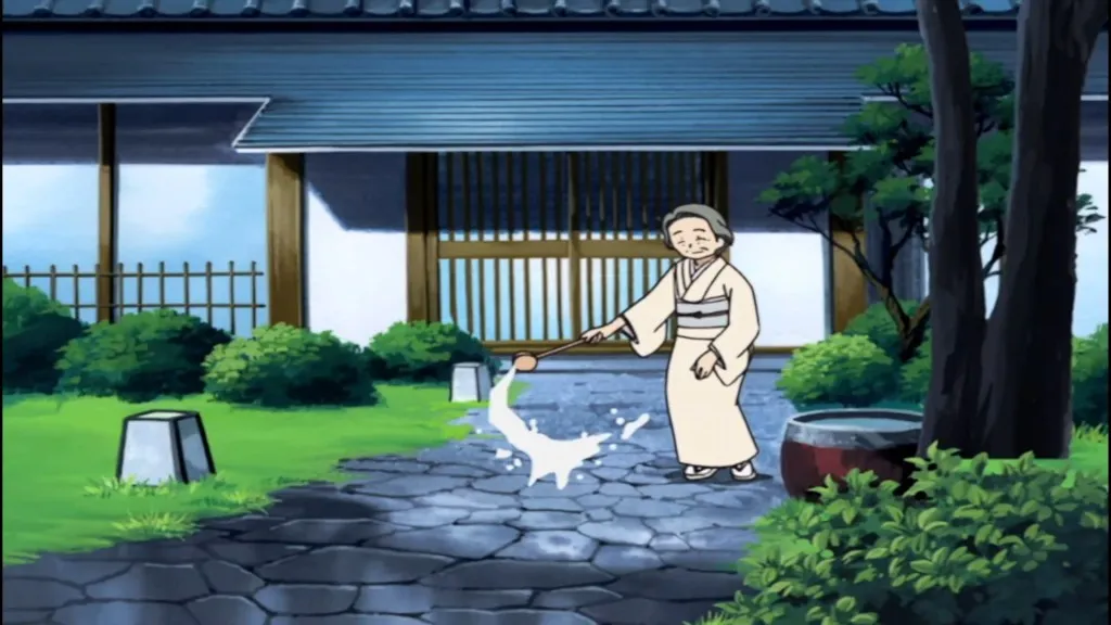 忠太郎と遊ぶ遊びに夢中でさなえの接近に気づかず慌てて忠太郎のかげに避難した。
