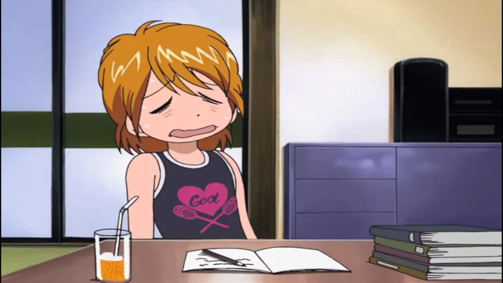 暑さに宿題が進まない。日々宿題をするひかりに関心。だされた羊羹に大喜び。さなえの
